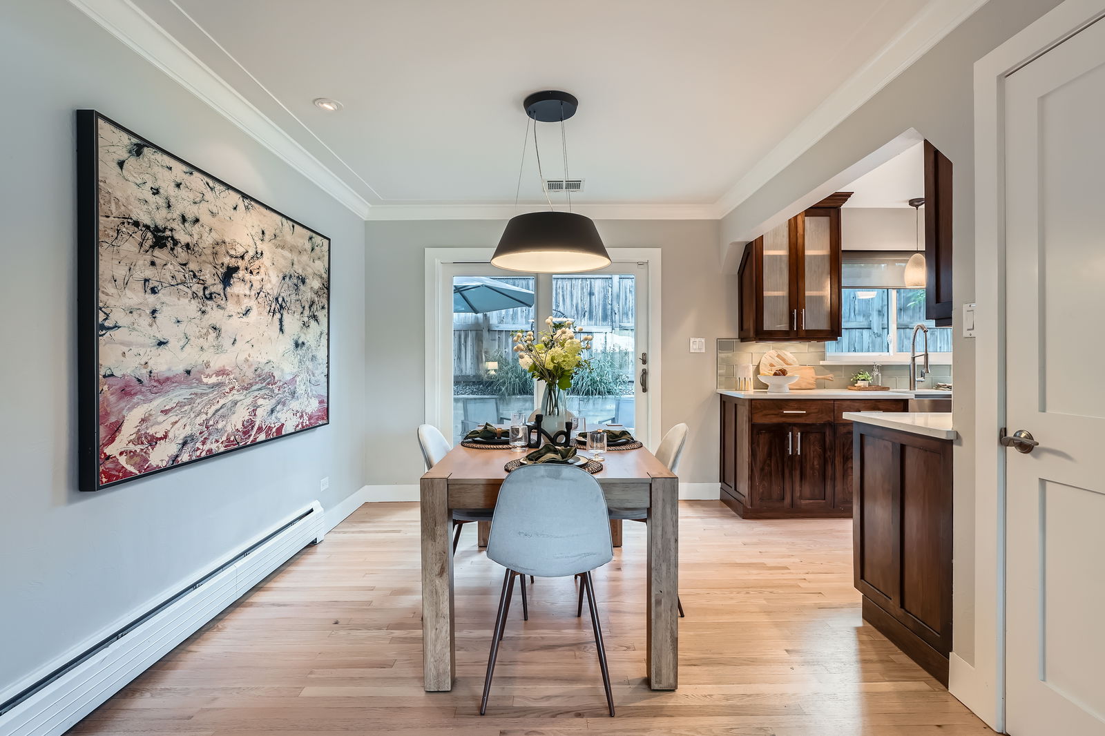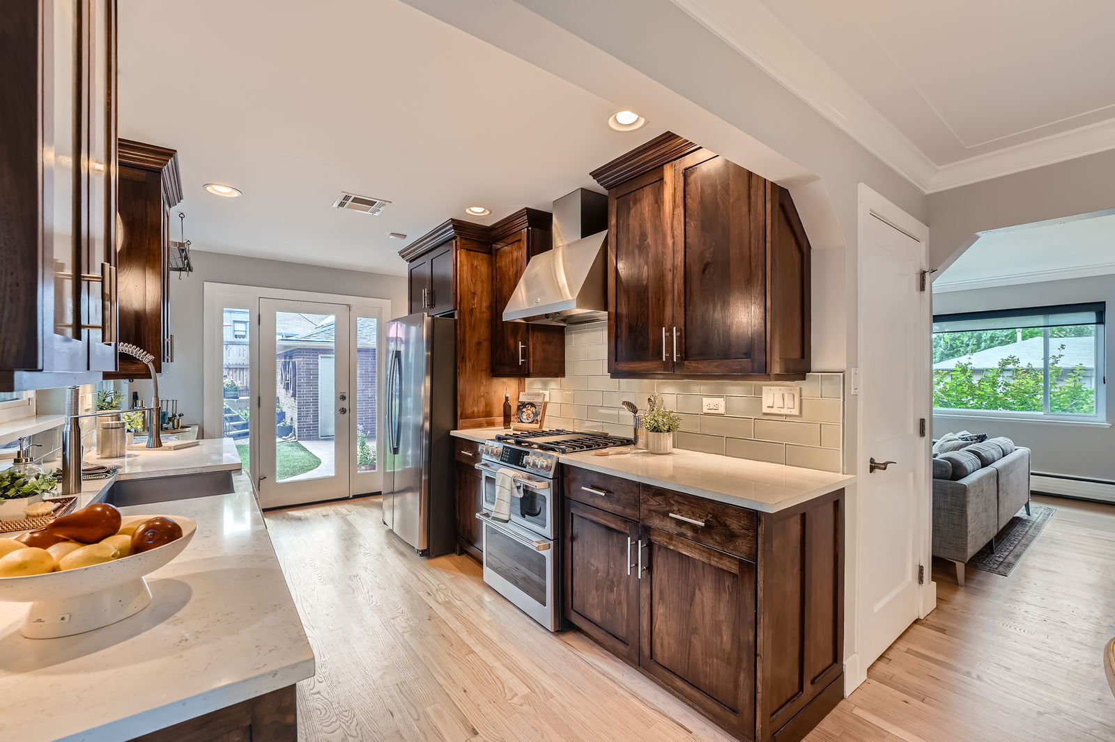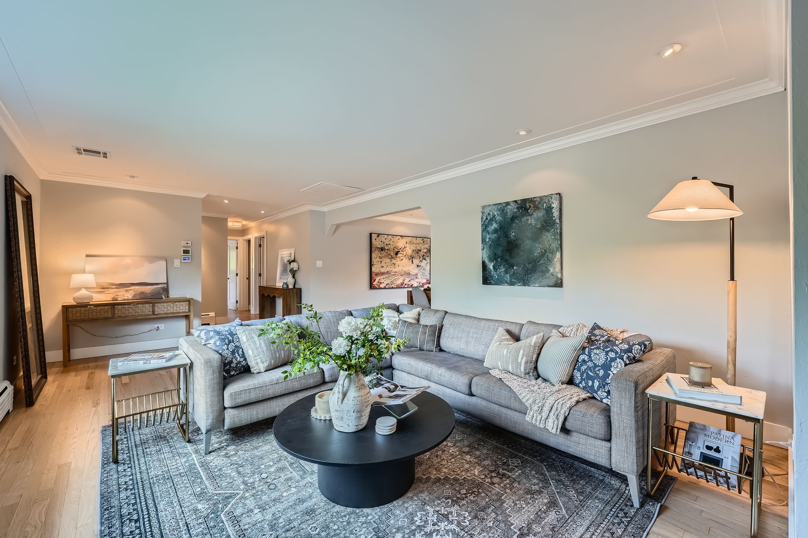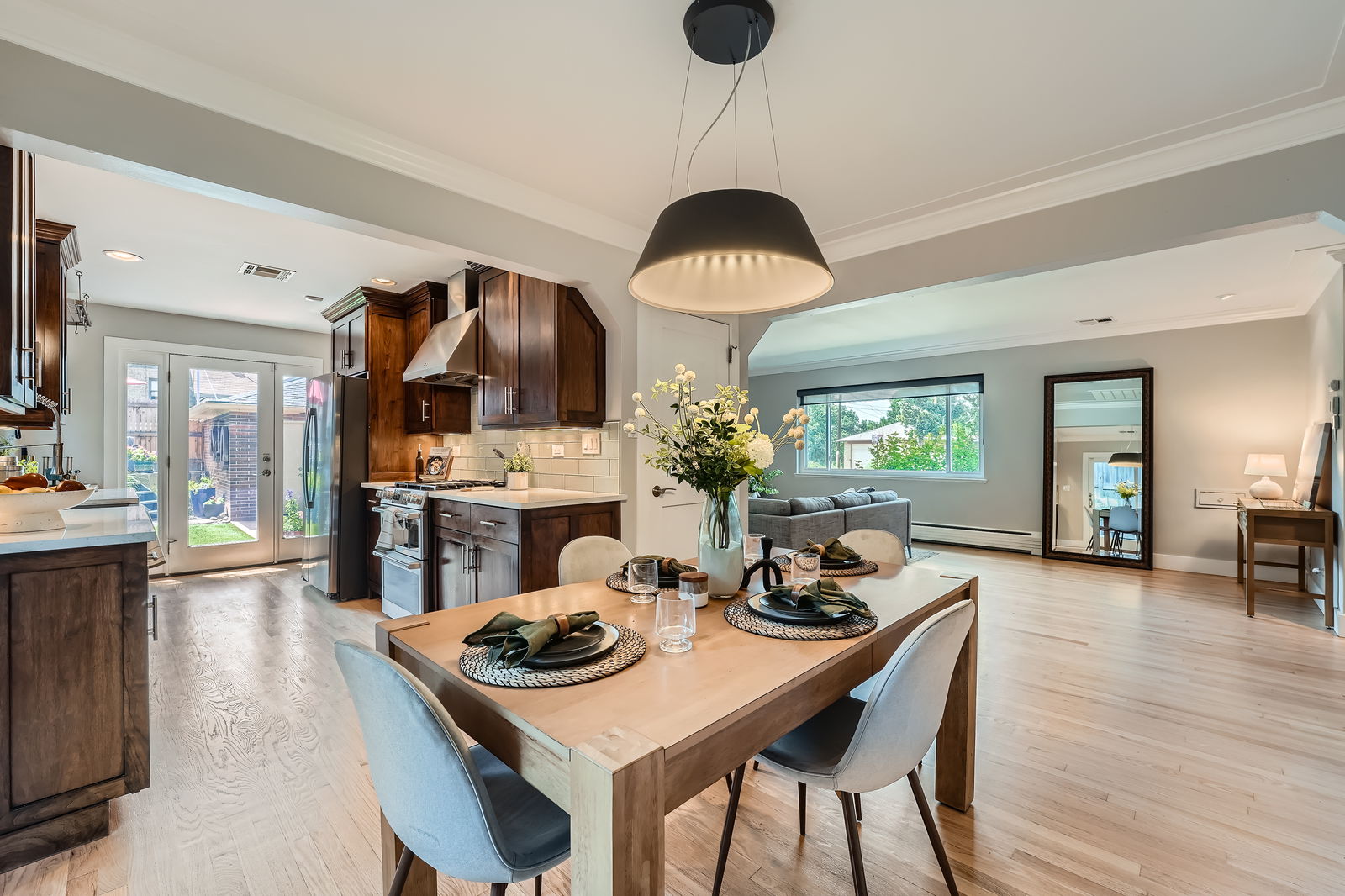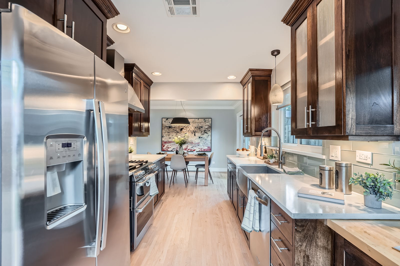 The main level features a spacious living room with a wood-burning fireplace, a formal dining room, and a well-designed kitchen, three bedrooms, a full bath, and a half-bath. Newly refinished hardwood floors, professional lighting, and exquisite designer details throughout enhance the home’s appeal.