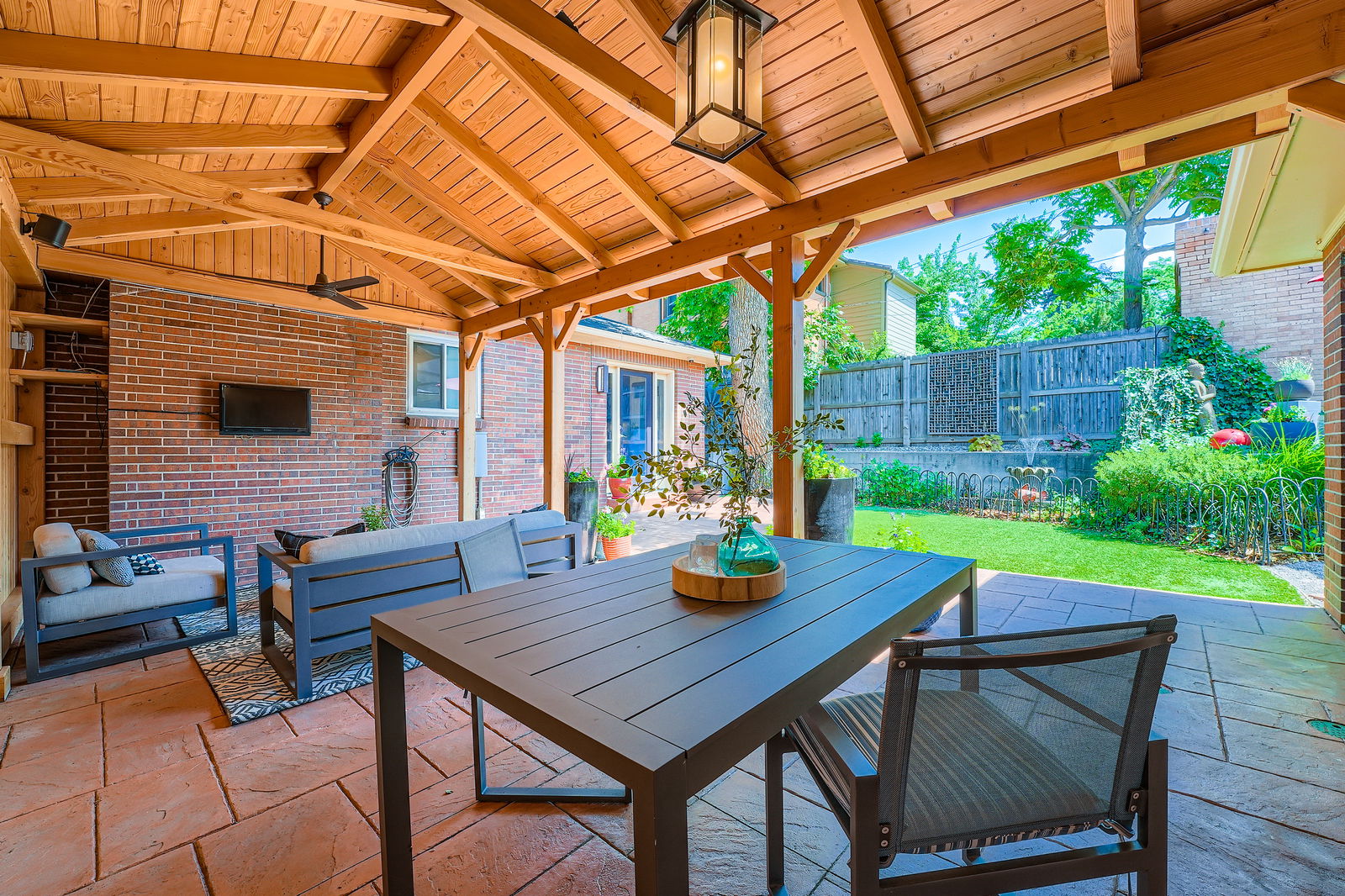 Step outside into the professionally landscaped backyard — an outdoor oasis featuring a two-level patio, fountain, and side deck. The custom gabled patio roof provides a cozy, sheltered space perfect for relaxing, dining, entertaining, or enjoying some quiet time. Additionally, a two-car detached garage and storage shed are easily accessible, offering convenient storage solutions.